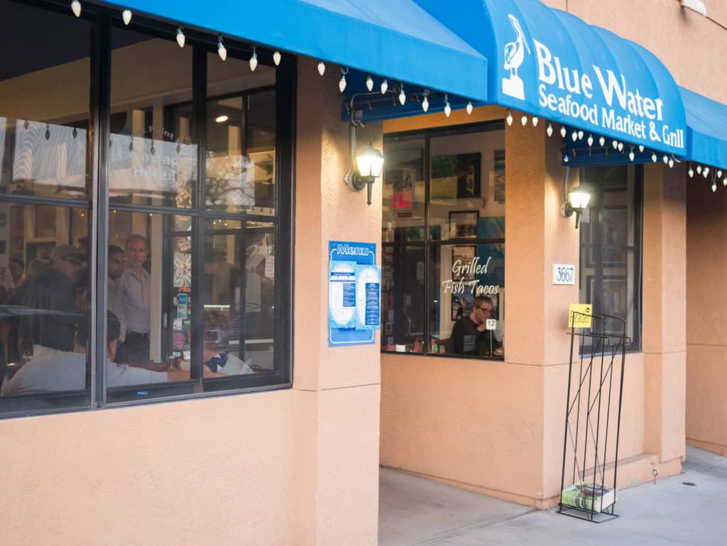 Blue Water Seafood Market & Grill is an unpretentious seafood restaurant, which makes perfect sense; it is a reflection of the Mission Hills neighborhood of San Diego that prides itself on embracing the simple life. The restaurant is on the ground floor of a two-story brown building with an industrial persona, except for its bright blue awning and a single gaslamp-style street light out front. Make no mistake about what lies within this restaurant. Blue Water Seafood Market & Grill has been voted one of America’s Top Restaurants by Zagat.com, and has been featured on Food Network’s Diners, Drive-Ins, and Dives, hosted by Guy Fieri.