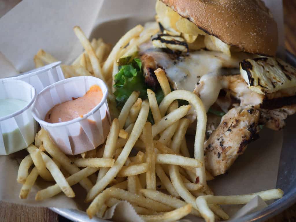 If the selection of about a dozen burgers including a lamb burger and a tofu burger haven’t tempted you, try one of their other specialty sandwiches. Try the Meso Tasty – teriyaki chicken with garlic aioli, grilled pineapple, Swiss cheese, Maui onion chips, and red pepper aioli. Two other favorites are fish n’ chips – beer battered haddock, thick cut chips, and coleslaw, or the OB Cheesesteak – marinated thin-sliced steak loaded with peppers and onions and topped with jalapeño cheese. Diners rave about the Chicken & Waffles – waffle, carmelized banana, shaved almond, peanut butter mousse, and fried chicken wings, but it’s only available for weekend brunch.